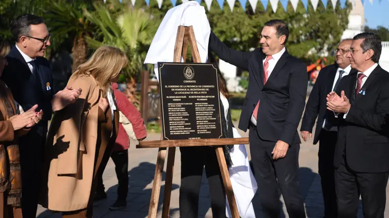 Como parte de las actividades en conmemoración del Bicentenario de Bella Vista, previo al acto, en la Plaza Pedro Ferré, el gobernador Gustavo Valdés, junto a la intendente Noelia Bazzi y demás autoridades, procedió al izamiento del Pabellón Nacional, tras lo cual se realizaron las ofrendas florales, descubrimiento y bendición de placa alusiva al aniversario, en el monumento del Brigadier Pedro Ferré.