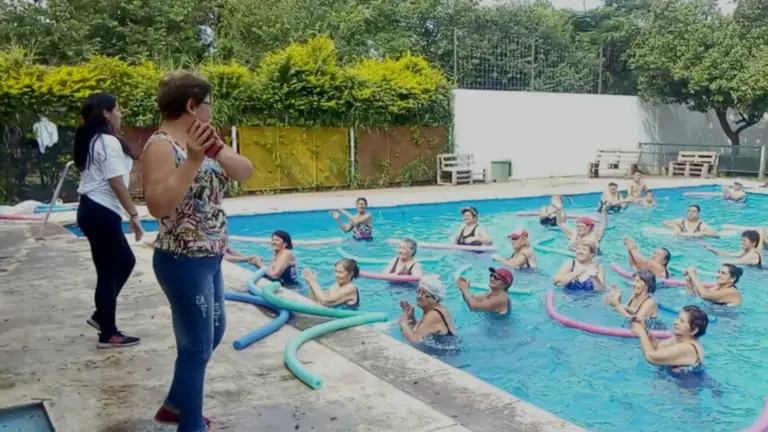 Durante las jornadas, los participantes pueden acceder a la pileta y a distintas actividades recreativas, entre ellas bailes, juegos, gimnasia pasiva y gimnasia acuática.