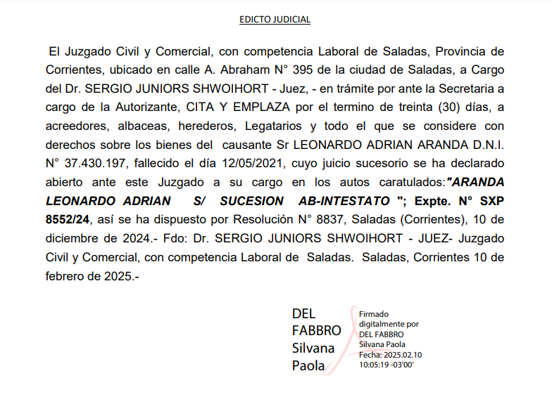 Detalles de ARANDA LEONARDO ADRIAN S/ SUCESION AB-INTESTATO Expte. N° SXP 8552/24 en Corrientes | Clasificados El Litoral