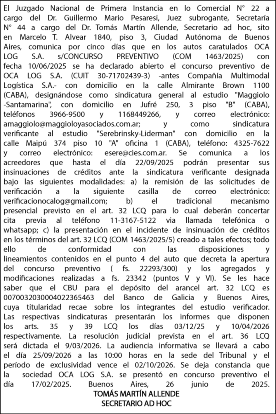 Detalles de OCA LOG S.A S/CONCURSO PREVENTIVO (COM1463/2025) en Corrientes | Clasificados El Litoral