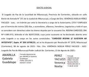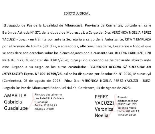 Detalles de CARDOZO REGINA S/ SUCESIÓN AB INTESTATO EXPTE NRO. 209 10799/25 en Corrientes | Clasificados El Litoral