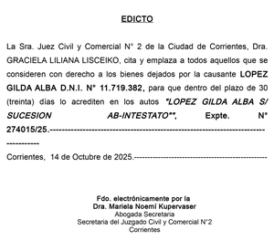 Detalles de ED. LOPEZ GILDA ALBA S/SUCESION AB-INTESTATO en Corrientes | Clasificados El Litoral