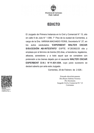 Detalles de ESPERBENT WALTER OSCAR S/SUCESIÓN AB-INTESTATO en Corrientes | Clasificados El Litoral