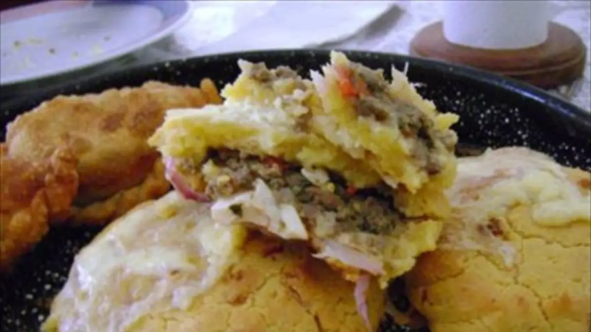 Preparación: se bate con la mano la grasa hasta que obtenga la consistencia de una mezcla blanca y cremosa. Se agregan huevos, sal y queso desmenuzado, batiendo muy bien después de cada adición. Se mezcla con la harina de maíz, el almidón y la leche y se amasa. Con la masa ya dispuesta se forman bollos del tamaño de una galleta grande y se los ahueca con el pulgar. En el hueco se introduce el relleno, una mezcla de huevo picado y carne en “picadillo”. Se cierra el bollo y se le da forma, de modo a que quede como una torta de aproximadamente 7 centímetros de diámetro. Finalmente, se colocan las tortas sobre chapa engrasada y se las pinta con leche, luego de lo cual se las cocina al horno a alta temperatura (250°) por veinte minutos.
