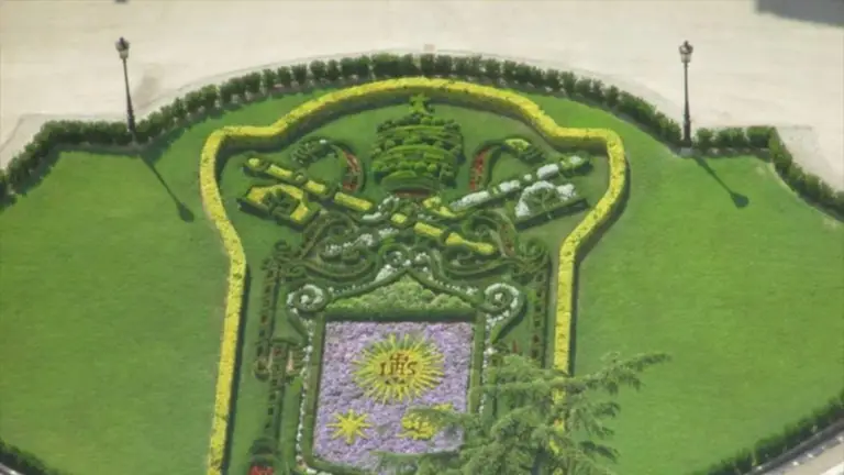 Sobre el escudo, azul, se hallan los símbolos de la dignidad pontificia, iguales a los que deseó el predecesor, Benedicto XVI (mitra entre llaves de oro y plata, entrelazadas por un cordón en cuyo centro hay flores rojas).