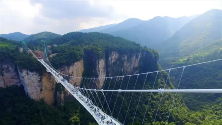 Esta portentosa obra se alza a 300 metros de altura sobre el gran cañón de Zhangjiaji y ostenta 10 récords mundiales. Además de ser el más alto del planeta, también es el más largo (430 metros en total, 375 si solamente se cuenta la parte que cuelga) y cuenta con la plataforma más elevada del mundo para practicar puenting y con el columpio más largo de Asia. La pasarela está hecha de grandes paneles de cristal de unos 6 metros de ancho y puede sostener a 800 personas.