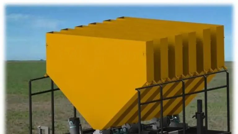 l Plantación simultánea de tres surcos y sistema de tolvas pulmones: la máquina cuenta con 6 tolvas, 3 en funcionamiento y 3 de repostaje que se desplazan sobre una rielera lo cual permite hacer un cambio rápido y sencillo cuando quedan vacías de estacas. Cada tolva tiene una capacidad aproximada de 290 kg de estacas.