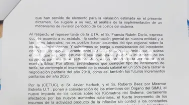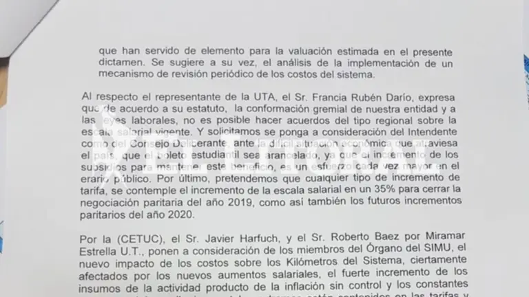 Textualmente, la UTA hizo constar en el acta al que tuvo acceso ellitoral.com.ar : "Solicitamos se ponga a consideración del Intendente como del Consejo Deliberante, ante la difícil situación económica que atraviesa el país, que el boleto estudiantil sea arancelado, ya que el incremento de los subsidios para mantener este beneficio es un esfuerzo cada vez mayor en el erario público".