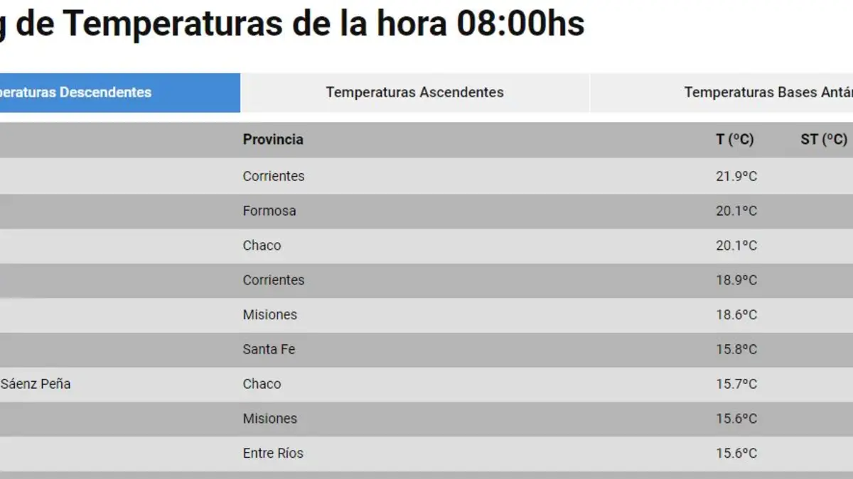 Asimismo, la ciudad de Paso de los Libres -con una temperatura que roza los 19°- se encuentra en el cuarto escalón de la serie elaborada por el SMN, que tiene a Resistencia, Chaco, en el tercer lugar, con 20,1°.