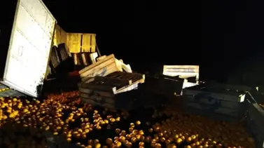 Volcó anteanoche un camión con acoplado repleto de naranjas en la ruta provincial de acceso a Monte Caseros, por lo cual debieron intervenir los bomberos voluntarios de aquella ciudad.