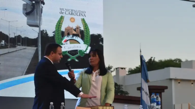 En un concurrido acto realizado en la plaza Independencia de Carolina, el jefe comunal Elvio Sanabria juró y asumió su segundo mandato. Previo a la jura de Sanabria, se llevó a cabo el cambio de autoridades del Concejo Deliberante. La concejala electa Cristina Santajuliana tomó juramento a su cargo, no así Gerardo de Bortoli, por estar aislado por contacto estrecho.