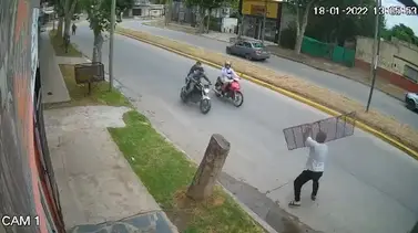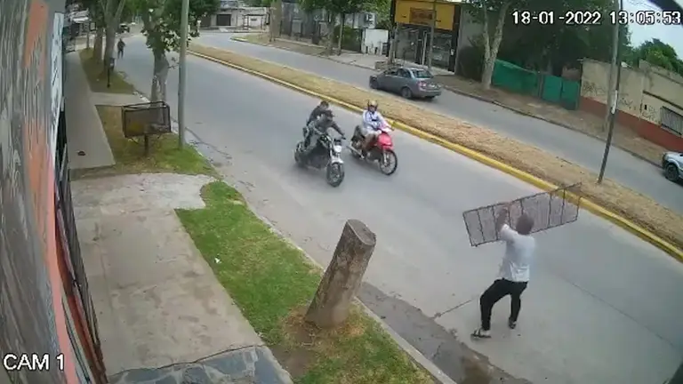Según se puede ver en las imágenes, el hombre se encontraba retirando las rejas del frente del comercio cuando vio que se aproximaban dos presuntos motochorros que perseguían supuestamente a un motociclista para robarle. Ante esa situación, con una de las planchas de metal en la mano, esperó que se acercaran del todo y arrojó la reja directo a las ruedas de una de las motos para detenerlos.