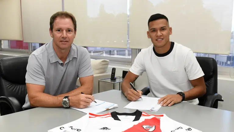 Herrera, de 23 años, selló su vínculo en compañía del presidente de River, Jorge Brito, y el vicepresidente primero, Matías Patanian, en las oficinas del club, en el Monumental.