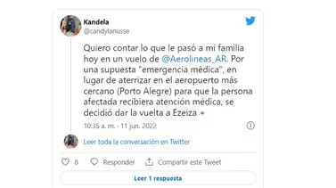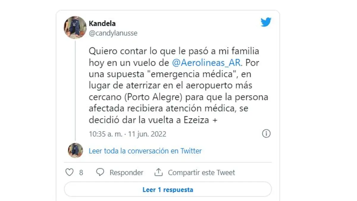 Candela Lanusse, la usuaria que relató en detalle lo sucedido en su cuenta, comenzó su exposición: "Quiero contar lo que le pasó a mi familia hoy en un vuelo de Aerolíneas Argentinas por una supuesta 'emergencia médica'. En lugar de aterrizar en el aeropuerto más cercano (Porto Alegre) para que la persona afectada recibiera atención médica, se decidió dar la vuelta a Ezeiza".