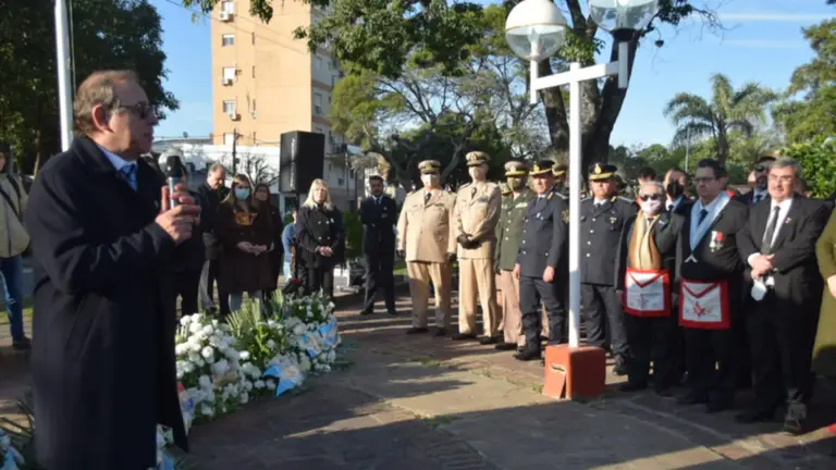 Los actos centrales se iniciaron en el mástil de la ciudad, con el tradicional izamiento de la bandera nacional. Luego, en la plazoleta que lleva el nombre del general Manuel Belgrano, se depositaron ofrendas florales.