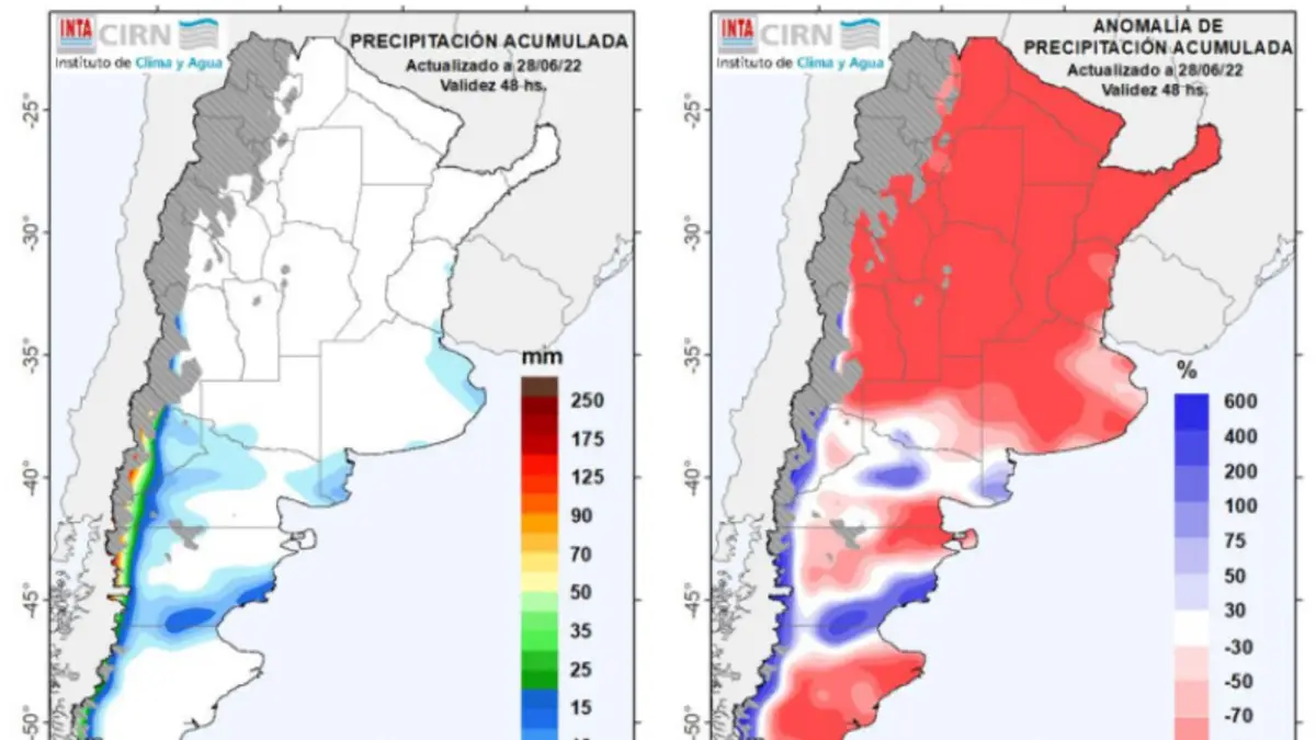 De acuerdo al último informe semanal del Instituto de Clima y Agua del INTA, nuevamente se daría una semana con lluvias que estarán prácticamente ausentes en la Región Pampeana y norte del país, exceptuando la probabilidad de lluvias y chaparrones que se prevén para sur y norte de Buenos Aires, sur de Santa Fe y Entre Ríos. Mientras que se esperan lluvias y nevadas de variada intensidad sobre zonas cordilleranas de Mendoza y Patagonia.