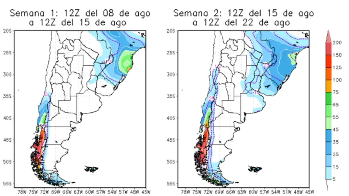 En la semana hasta el día 15 de agosto, no se esperan lluvias significativas para las cuencas bajo vigilancia. Mientras que, en la semana hasta el 22 de agosto, se prevé una baja probabilidad de ocurrencia de precipitaciones del orden de 5 milímetros entre el 16 y el 18 de agosto sobre el tramo medio este del río Paraná.