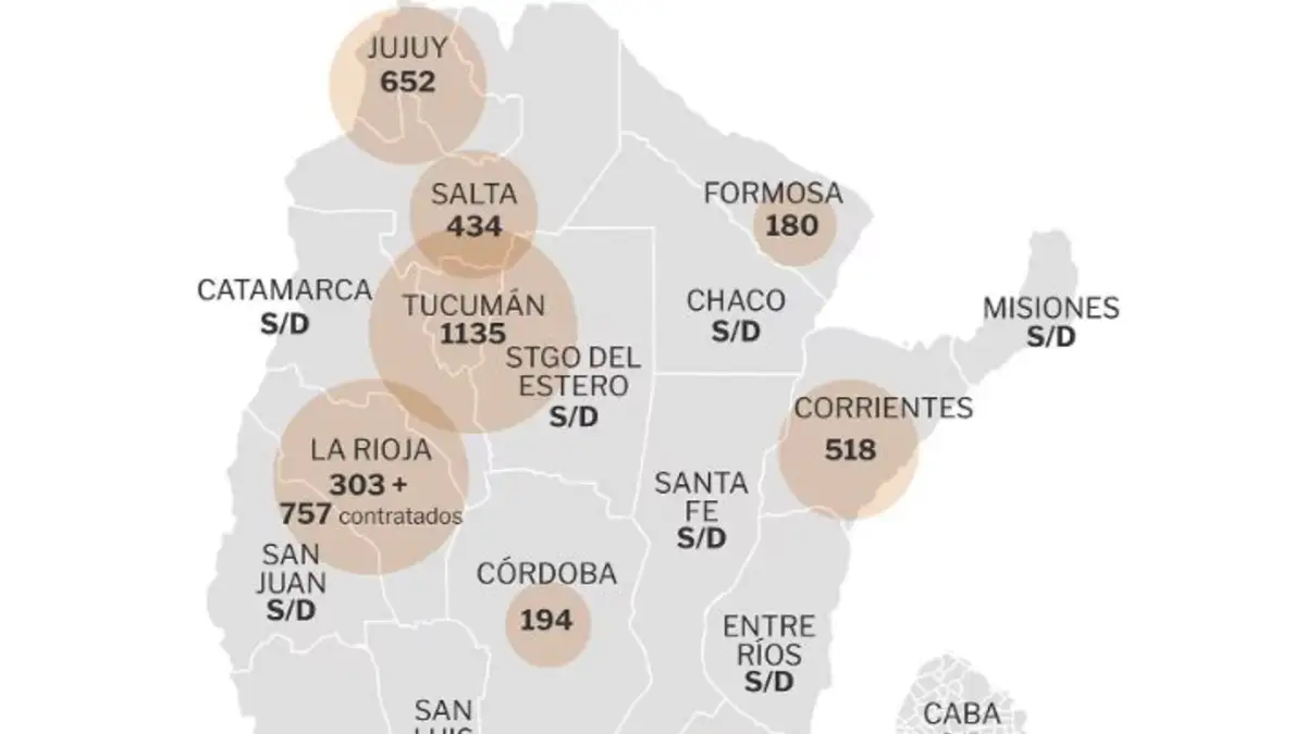 Son las provincias de Tucumán con 1.145 empleados que cobran el Potenciar Trabajo; La Rioja, con 1.060 -divididos en 303 de planta permanente y 757 contratados-; Jujuy, 652; Corrientes, 518; Salta, 434; Río Negro, 198; Córdoba, 194; Formosa, 180; y Santa Cruz, con 128.