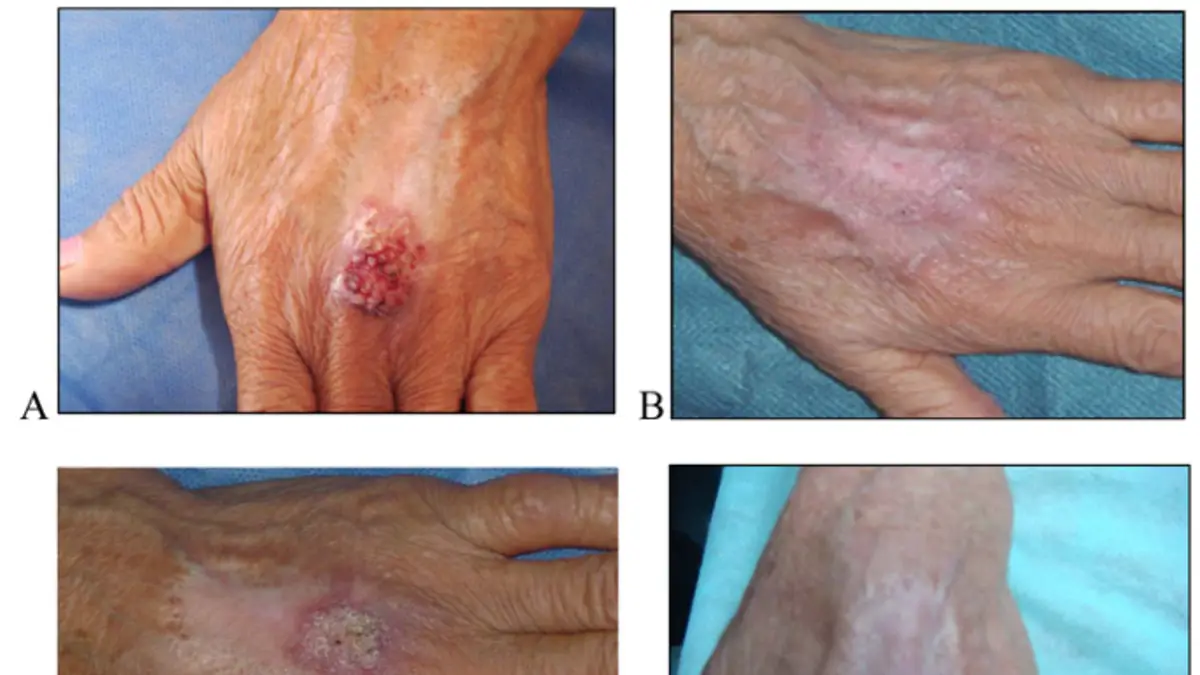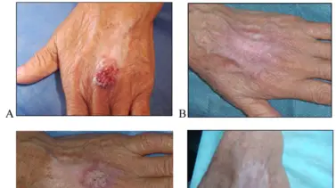 Una trabajadora rural de 82 años de Corrientes, provincia del noreste de Argentina, ingresó al hospital con un tumor en forma de placa tematosa, escamosa y espesa en la mano izquierda, con una lenta expansión de alrededor de 2 años de duración. Al examen físico se evidencia lesión tumoral seca de 4× 3cm cubierta por escamas gruesas, sin necrosis ni secreción.