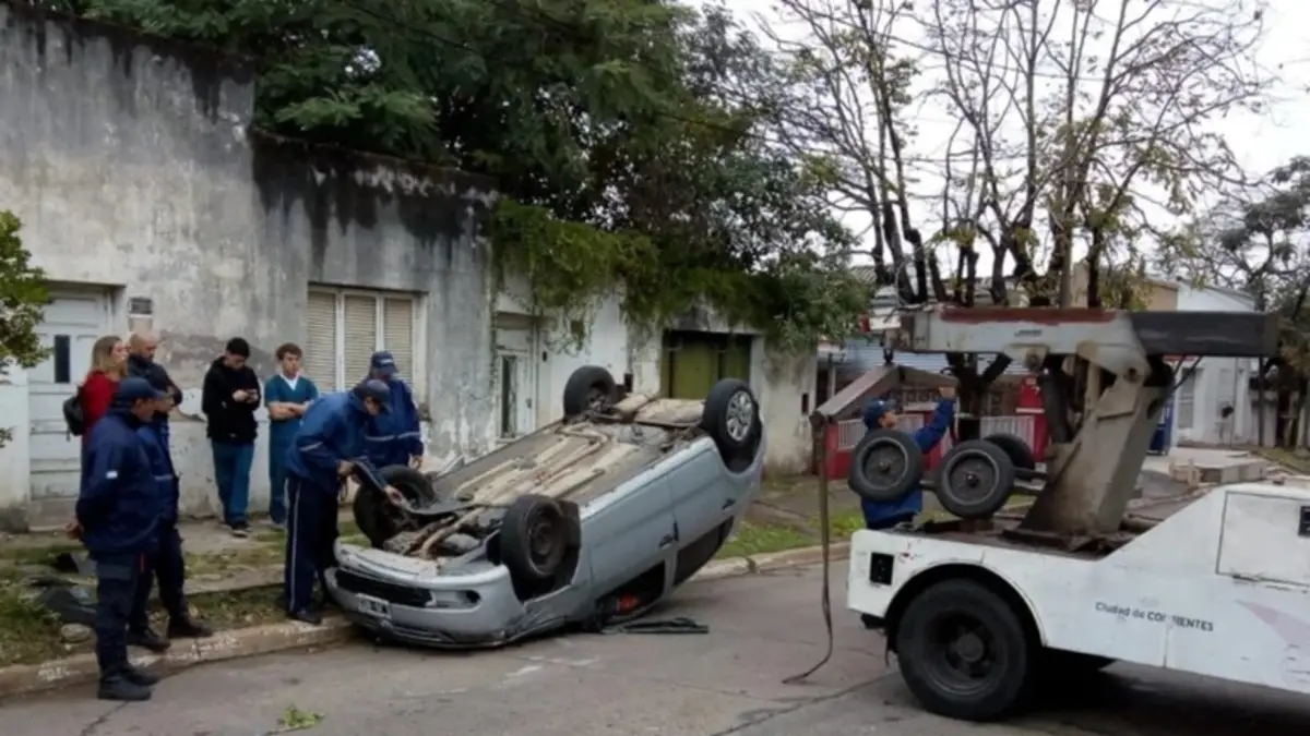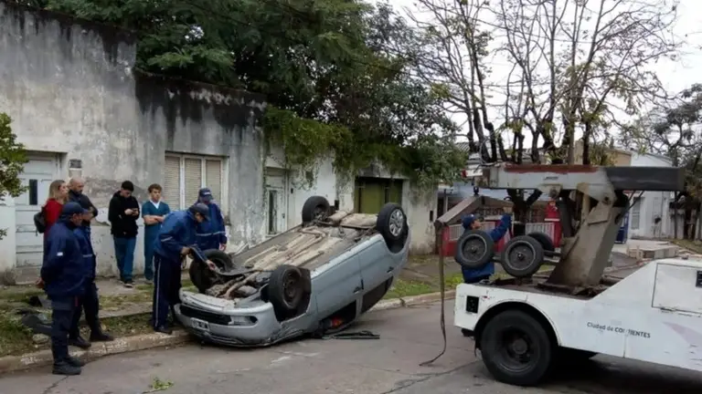Un automóvil terminó volcado frente al parque Mitre luego de que chocara contra una camioneta e impactara contra un poste de alumbrado público. Afortunadamente el conductor del auto no sufrió lesiones.
