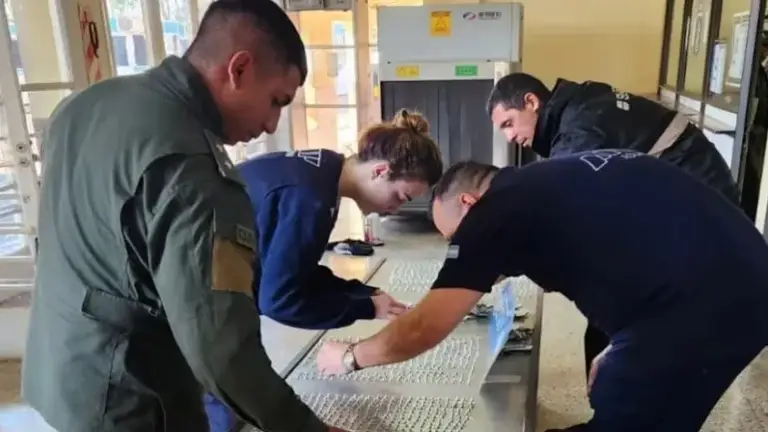 Tras el control a ambas personas, se comprobó que tenían paquetes adheridos a sus cuerpos y que en los mismos encontraron pastillas, como así también dentro de termos.