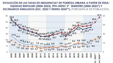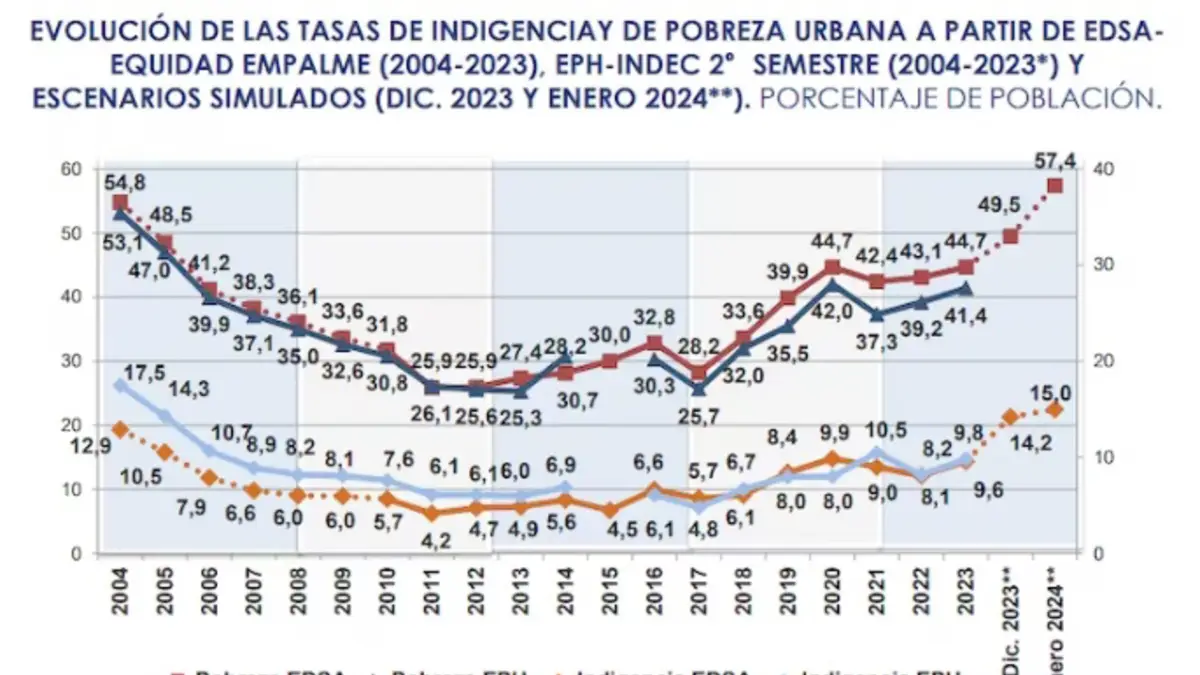 El Observatorio de la Deuda Social Argentina de la Universidad Católica Argentina (UCA) estima que la pobreza experimentó un brusco salto del 49,5% en diciembre de 2023 al 57,4% en enero de 2024, lo que la habría llevado a sus niveles más altos en los últimos 20 años, según el informe “Argentina siglo XXI: Deudas sociales crónicas y desigualdades crecientes. Perspectivas y desafíos”, que se difundió este fin de semana.