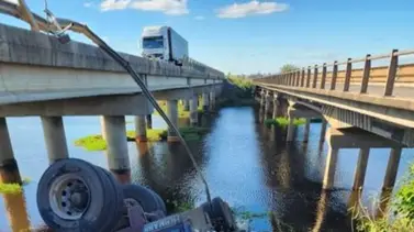 Se trata de un vehículo perteneciente a una empresa de transporte de la mencionada localidad correntina, cuyo acoplado se desprendió y terminó volcando desde uno de los puentes, rompiendo el guardarrail y quedando entre medio de ambos puentes.
