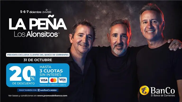 Los clientes del Banco de Corrientes podrán acceder a una promoción especial para adquirir entradas para La Peña de Los Alonsitos, que se realizará del 5 al 7 de diciembre de este año en Zavod, Corrientes. Este encuentro musical, que lleva más de 15 ediciones, convocará en esta oportunidad a destacados artistas nacionales y locales como Axel, Los Tekis, Los Nocheros y “El Indio” Lucio Rojas, entre otros.