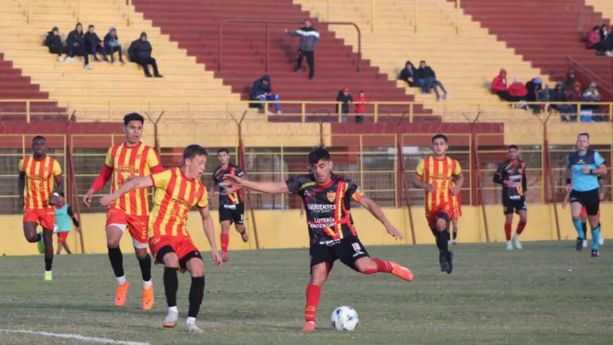 El Aurirrojo correntino comenzó a amigarse con la pelota promediando la etapa inicial, cuando tuvo su primera jugada de peligro. Joaquín Livera llegó hasta el fondo por la izquierda y se apoyó atrás en Albornoz, totalmente adelantado, quien sacó un centro al área que le quedó a Edgar Villán, quien sacó un remate mordido de zurda que se perdió muy cerca del vertical izquierdo.