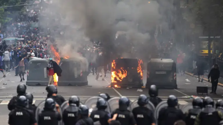 Ayer, se inició una jornada de violencia con enfrentamiento entre manifestantes y fuerzas de seguridad, que dejó destrozos en la vía pública y más de 70 contenedores de basura incendiados. Además, arrancaron baldosas de la Plaza Congreso para utilizarlas como proyectiles contra los agentes. La violencia se trasladó a otros puntos de la ciudad, incluyendo Plaza de Mayo, donde se registraron nuevos disturbios frente a la Casa Rosada.