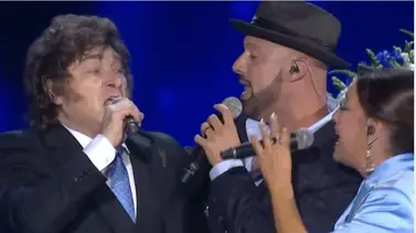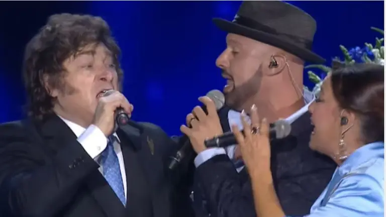 Milei fue recibido en el escenario con la canción española y una dupla de cantantes comenzó a interpretarla. Rápidamente le alcanzaron un micrófono y el mandatario se les unió en el canto. Concluida su presentación se dirigió al pebetero donde tuvo a su cargo el encendido de la última de las 12 antorchas.