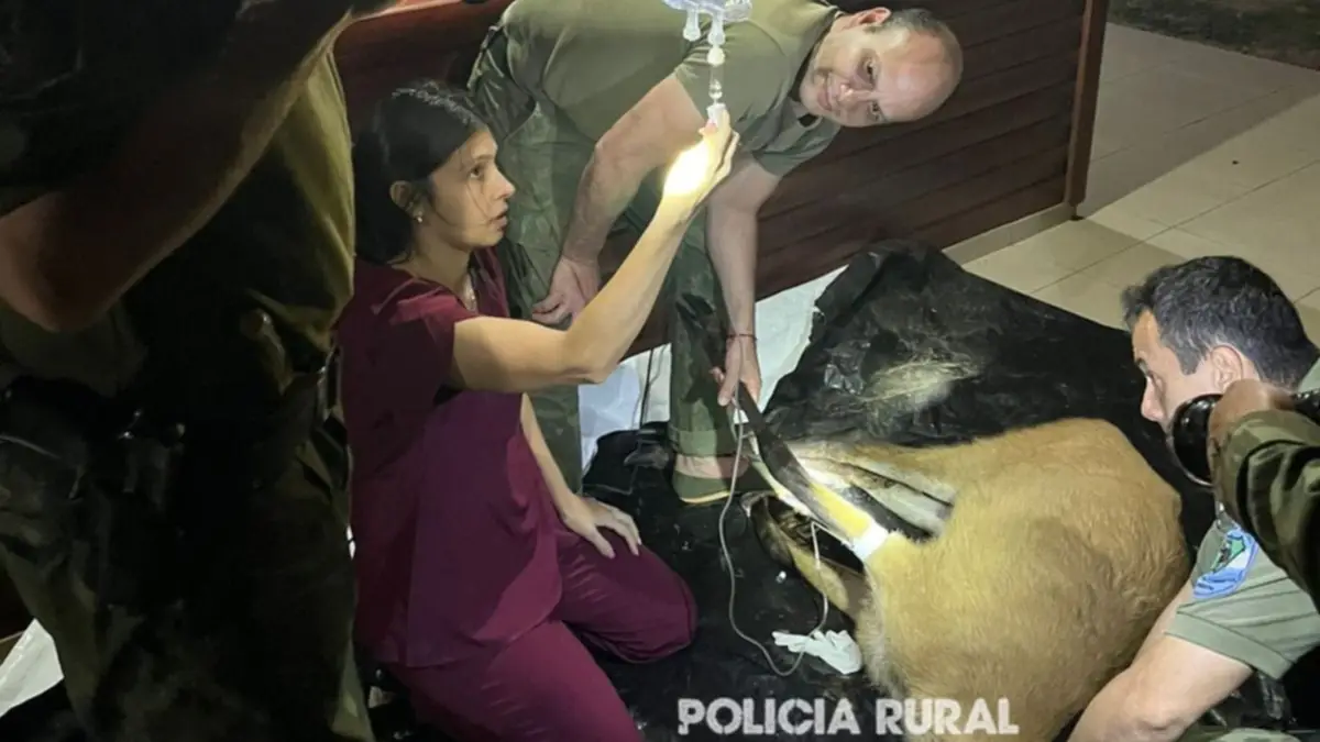 El animal presentaba una lesión en la mandíbula y signos de bicheras avanzadas. Con extrema precaución, los efectivos rurales lograron capturarlo y brindarle los primeros auxilios junto a la veterinaria María Belén Bissaro, quien supervisó su atención.