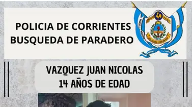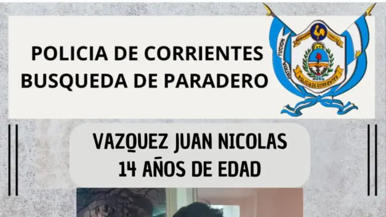 La Policía de Corrientes informó que se deja sin efecto el pedido de búsqueda sobre la localización de un menor. Se trata de Juan Nicolás Vázquez de 14 años quien fue encontrado sano y salvo este martes por la mañana.