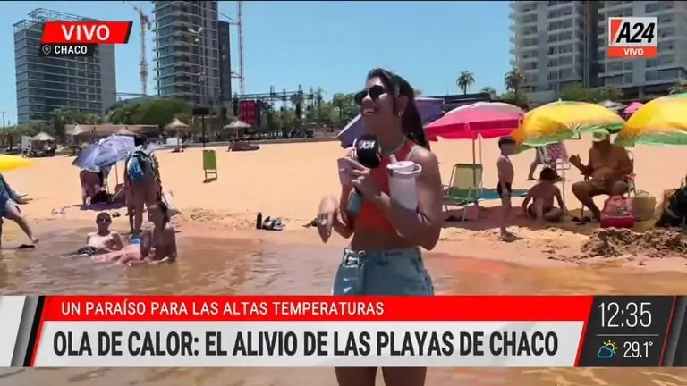Lo insólito se vio cuando Díoaz anunció: “Nos vamos a otra zona de la República Argentina, nos vamos al Chaco”, y en la pantalla apareció la leyenda "Ola de calor: El alivio de las playas de Chaco".