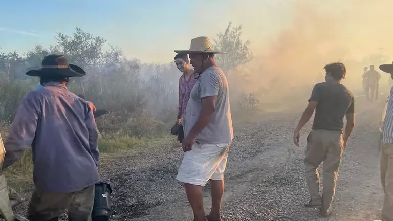 Tanques agrícolas convertidos e improvisados para proveer agua, tractores y sobre todo la cuadrilla de “menchos” y dueños de los campos que a la par, con cueros de oveja o ramas en mano, sacuden con fuerza contra el suelo sin parar.