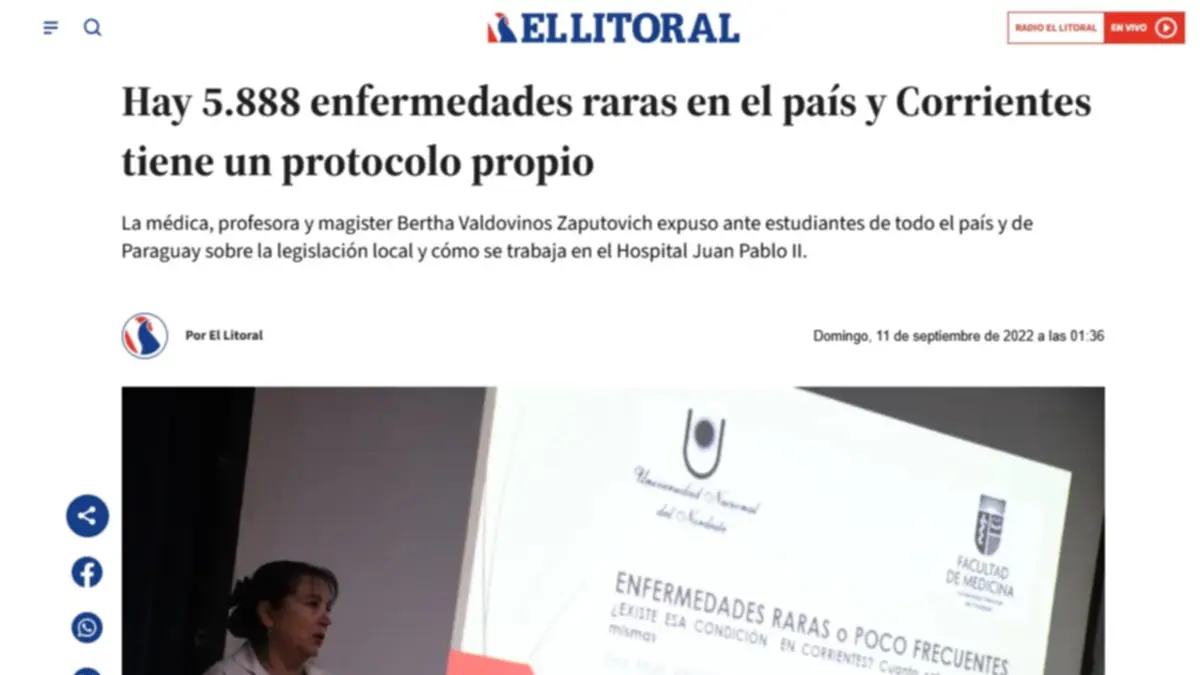 “En el Servicio de Anatomía Patológica y Citología del Hospital Pediátrico Juan Pablo II nos encontramos trabajando en el reporte de enfermedades poco frecuentes diagnosticadas en el centro de salud, cumpliendo con la legislación vigente. Se trabaja en vinculación con institutos, universidades, centros de investigaciones nacionales y extranjeras y denunciando obligatoriamente todo diagnóstico confirmado de EPF en Corrientes”.